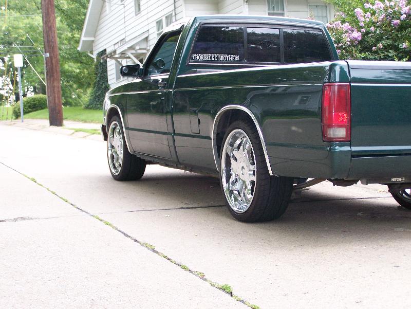 shaved tailgate, rollpan, sliding bed cover, metallic hunter green paint, imitation cowl hood,chrome grille, clear corners, chrome 93' bumper,all stock emblems and molding shaved off, sport mirrors, green neon under glow, hidden trailor hitch, flip up license plate.