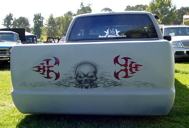 98 envot front end, shaved antenna,hood squiters, cab seams, gas door, custom third brake light, shoved and molded tailgate with customs taillights curtesy of TNT UNLIMTED!