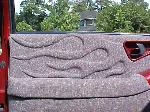 FULL TWEED INTERIOR WITH FLAMES ON HEADLINER DOOR PANELS, FLOOR, DASH AND REAR WAL AND SPEAKER ENCLOSURE ALL DONE BY MOONER AND ADAM SIMMONS OF WEST POINT CUSTOMS OF KATY TEXAS, INFERNO BILLET STEERING WHEEL, FLAME BILLET MIRROR, WHITE FACE GAUGES, CUSTOM CONTROL PANEL FOR NITROUS CONTROLS, CORBEAU RACING SEATS COVERED IN TWEED W/ RED VINAL INSERTS, SIMPSON FIVE POINT HARNESS ON DRIVERS SIDE, FOSGATE 12" HE2 SUBS X2, CUSTOM SPEAKER INCLOSURE, KENWOOD CD PLAYER, PAINTED DASH PIECES