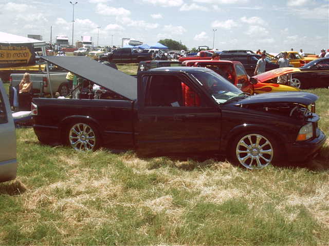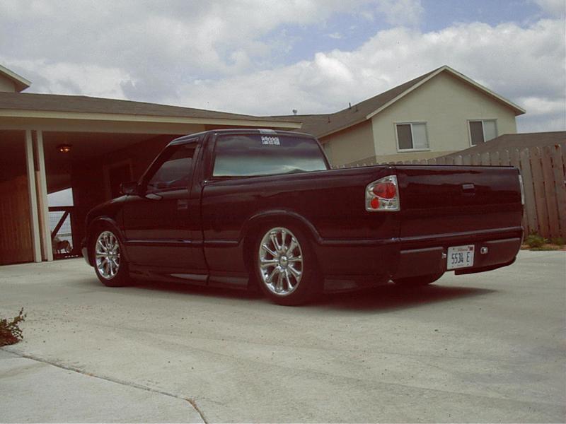 I replaced the stock s-10 hood with a sonoma hood. i have the extreme model so i have the side skirts. I added a roll pan and a flush mount cover from Checker Pro. the truck is covered in black factory paint. I shaved the mirrors. I converted the frontend to a GMC sonoma.