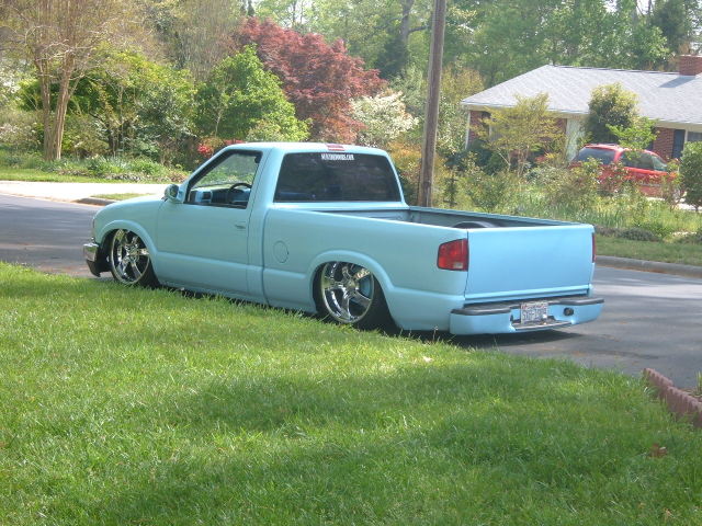2000 chrome front bumper, shaved tailgate handle, shaved antenna, hood squirters, and upper cab seams, trailer fenders welded in the bed...painted '91 Cameo S-10 pastel blue by me & dad