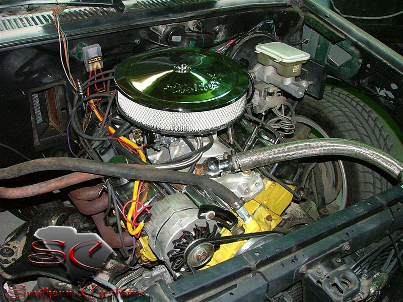 350, punched out 30 over, cam, edelbrock intake and carb, hedman headers