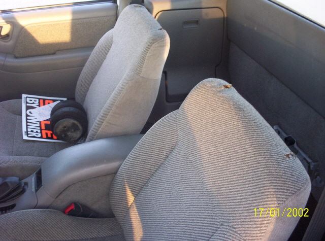 old skool Alter Images billet steering wheel, billet window cranks, Trenz billet flame rearview mirror,97 blazer seats, center console, painted white dash panel w/ graphics.