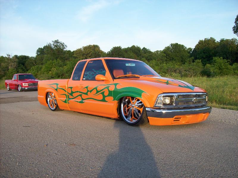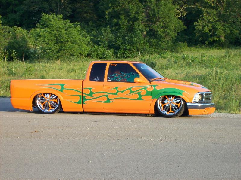 buckets out of a 2000 S-10 cover in orange and green vinal and a custom built fiberglass console and speaker box fiberglass dash door panels and headliner all other panels smoothed and painted