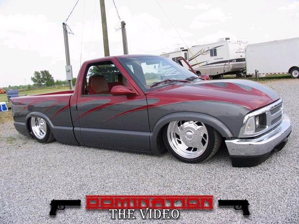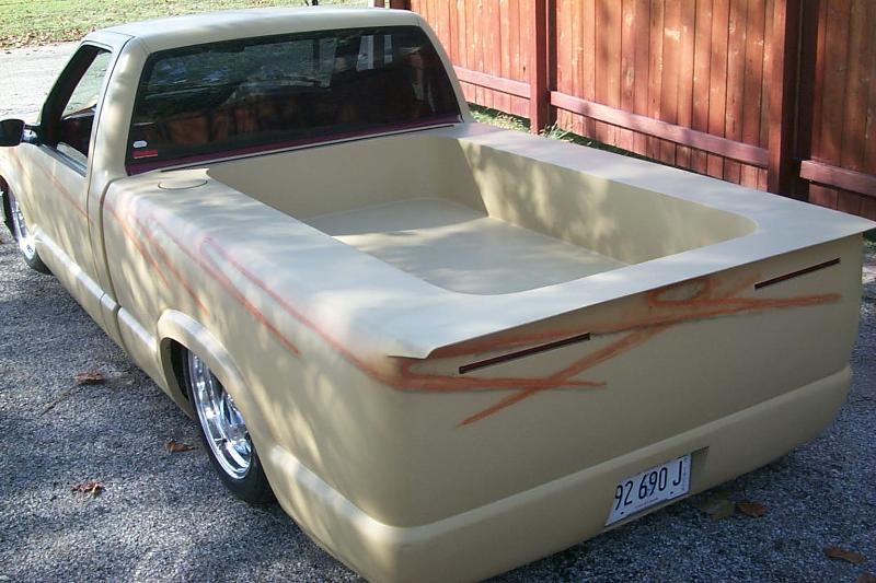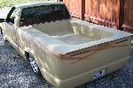 shaved every thing one off cowl hood,full sheet metal bed with small rear spoiler and led tail lights,plus a third brake light 3"body drop air accuated gas door