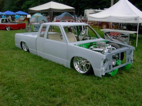 3 inch body drop shaved fuel door, wipers, mirrors, handles, tailgate, tail lights, upper body line, 4 inch leds in roll pan suicide doors shaved cowl. Sheetmetal bed flush mount fuel filler in bed floor, stock hood. Truck sprayed ppg lime time peral custom mixed color with hand made aluminum moldings.