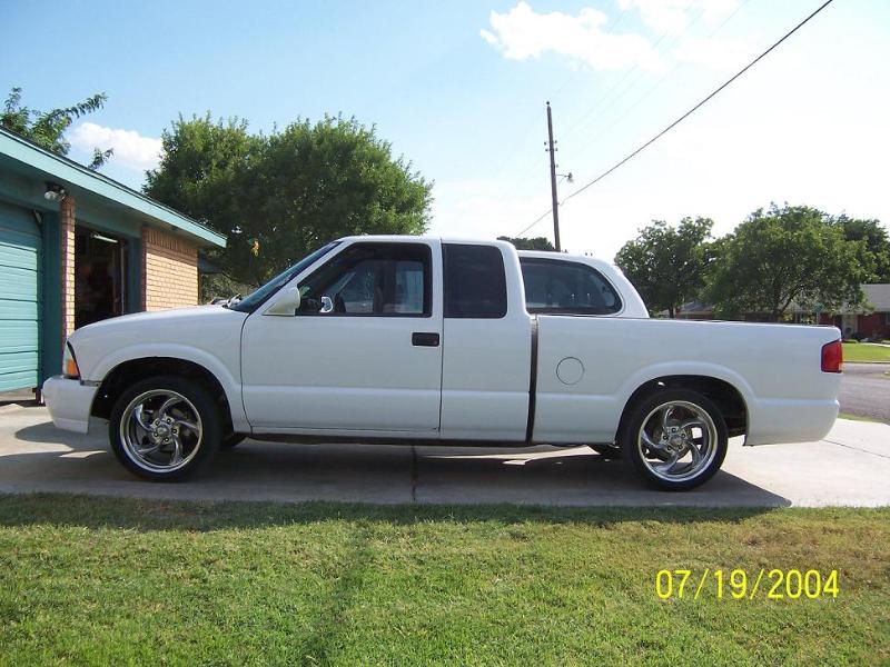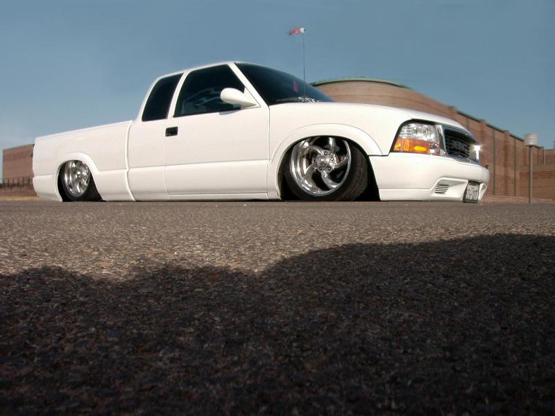 Whit extended cab, shaved tailgate handle and roll pan, frenched in license plate in tailgate at a 45 degere with painted triable flames coming off of it, 98-03 sonoma front clip