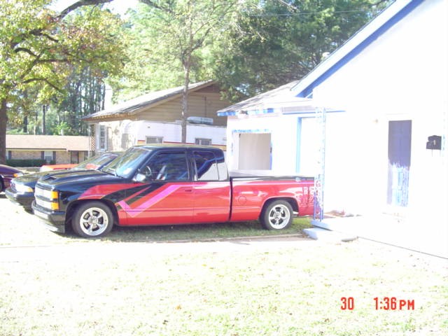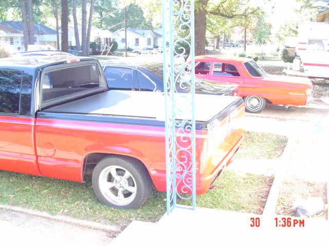 Shaved bed, electric roll down rear window, custom hood, custom red paint with way too much blue pearl. so yes it mostly looks pink