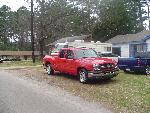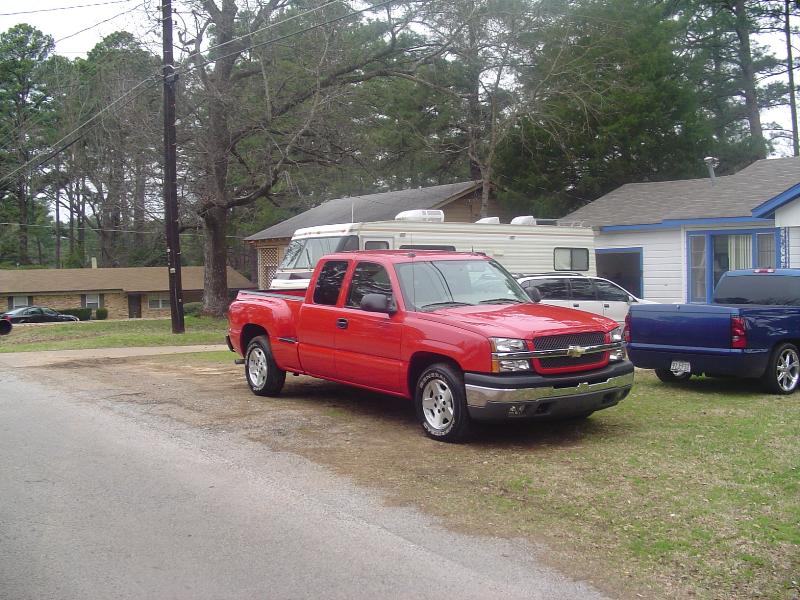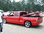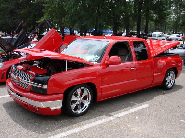 Victory Red, shaved all moldings, emblems, Roll pan, tailgate handle flip, Lo Rider bed cover, Escalade handles, painted mirrors and bumper plastic, Billet step plates, Billet grill
