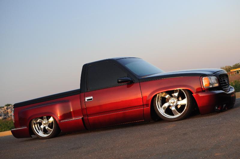 Truck is on air. Front-RE-7 Slam Bags, DJM 2" drop spindles, LRD upper and lower control arms. Rear-Wishbone with trailing arms and lever set-up, Bed has been body dropped 8".