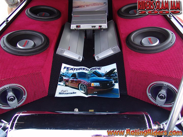Pioneer AVIC-N4 multimedia flip out head unit, Memphis MC 15-MC620 6.5" co-axial door speakers and 3" tweeters, 2 JL Audio 10" W-1 subwoofers behind each seat, 1 Rockford Fosgate P400 amp to drive the subs and components, Playstaion 2 gaming system.
