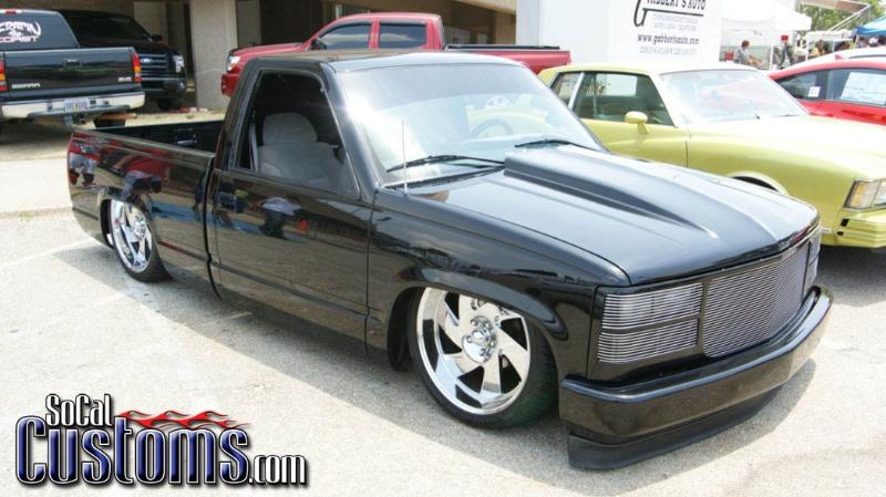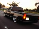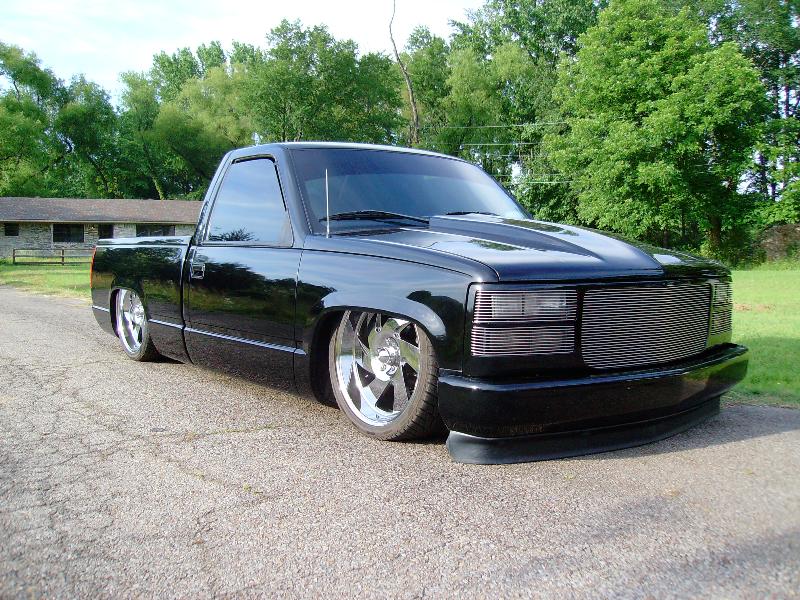 Painted Ford black, with a GMC grille with the 5-piece billet combo, painted bumper, shaved mirrors, smooth rollpan, and license plate frenched into the tailgate.
