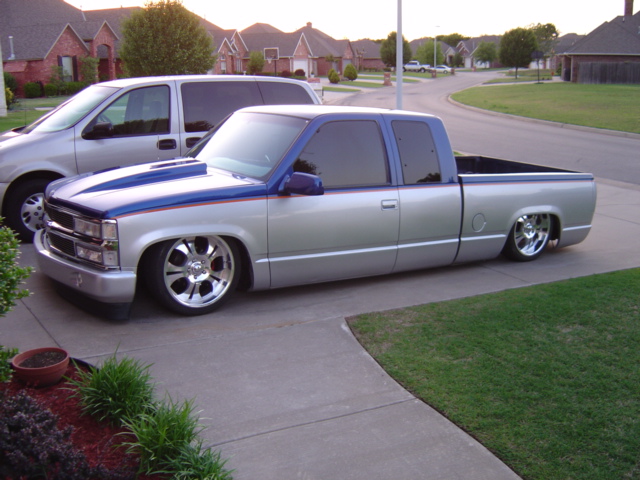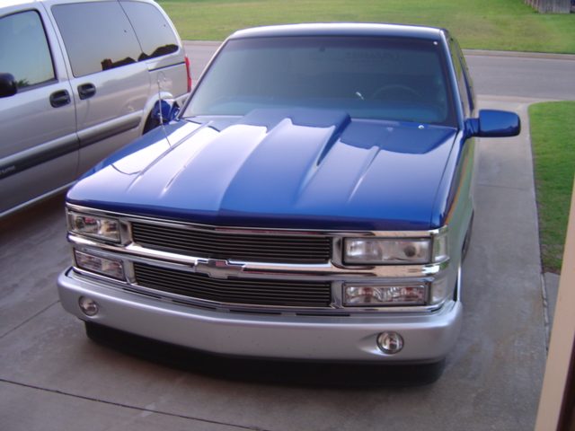 2 tone paint, shaved stake pockets, shaved tailgate, Chrome Chevy front end, and Cowl hood.