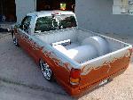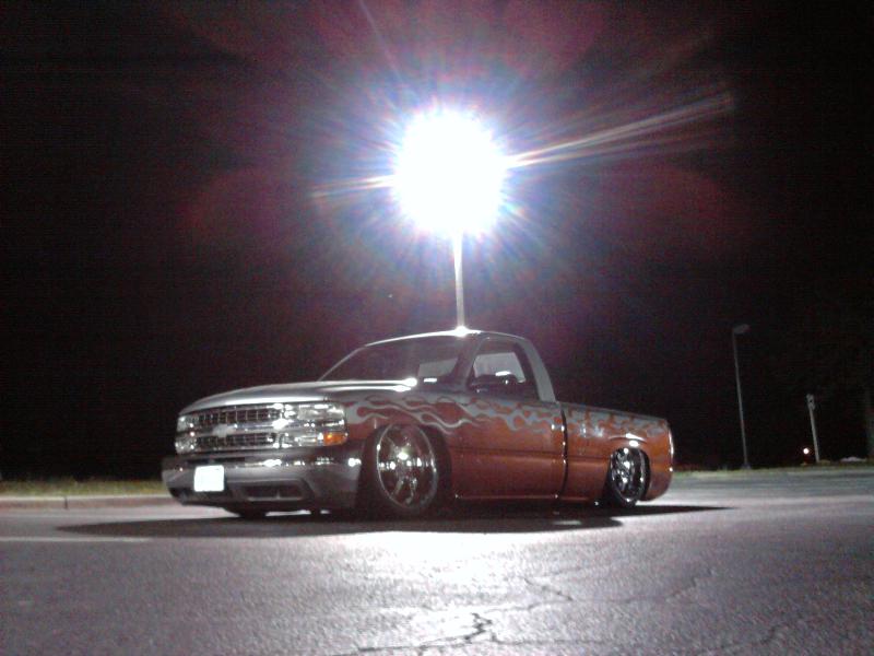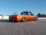shaved handles/tailgate, custom paint (stock scion burnt orange with "ice" in the flames on top of silver) Bed is tubbed out, all round...