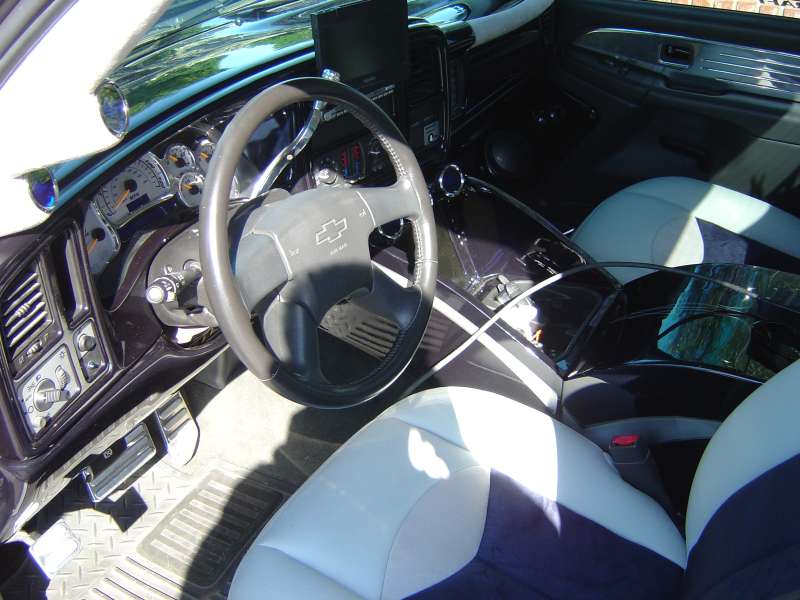 Nu Image dash cover painted to match the truck. Smoothed and paint-matched dash. Trenz door panel inserts, billet shifter, billet door sills. Nu Image billet gauge surround with platinum gauges. Dakota Digital air gauges, Dakota Digital tire pressure gauges, Dakota Digital boost gauge, and Dakota Digital clock. 9-switch air controller. Full Enduratex visions and suede interior custom-stitched by Stitchcraft and custom center console and amp-rack by South Coast Speed and Sound.