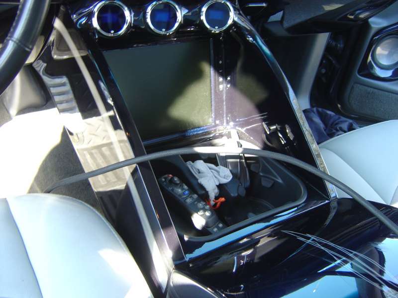 Rockford Fosgate flip-up 7" LCD TV unit with built-in DVD/mp3/TV tuner, Rockford Fosgate 1000W 10" subwoofer, Rockford Fosgate T8004 500Wx4 amp, Rockford Fosgate components with chrome crossovers, Rockford Fosgate wiring and fuses. Custom center console and amp enclosure and all work done by South Coast Speed and Sound in Orange, CA.