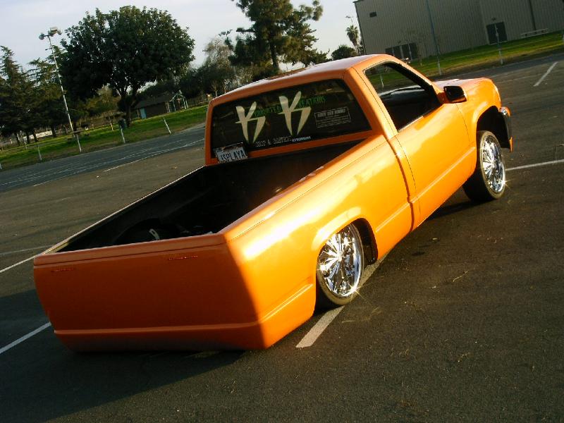 Tangelo Pearl, shaved doors, antenna, Caddy front end w/ 05 GMC bumper, fully tubbed in the back w/ LED'z