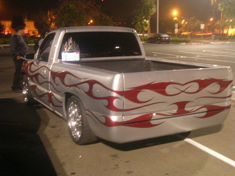 fully shaved in the back, LED'Z located between tailgate and rollpan, shaved stake pockets, 3rd brake light, 3D Billet Flame grille, smoothie steel bumper, clear lights in front, SS mirrors, AVS flame license plate holder, PAINT done by MIRANDAS KUSTOM in Visalia CA, paint is civic silver base w/ Razberry Pearl from House of Kolors tribal flames, airbrushed skulls throughout flames and on bumper