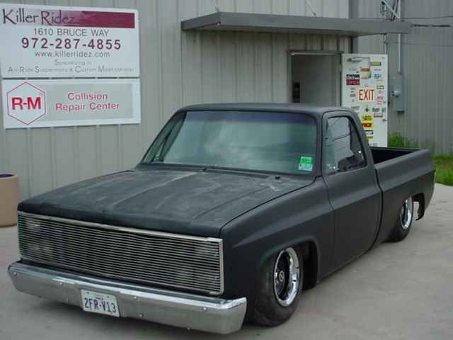 Flat Black, shaved handles, mirrors, drip rails, molding on the cab, emblems, side markers, tailgate, gas door(relocated to bed)...Thanx Killer Ridez