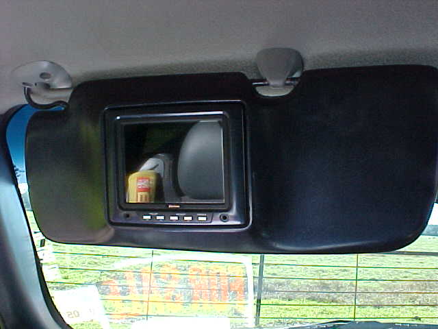 custom fiberglass sunvisors with 7 inch tvs, billet dash kit, dash trim painted purple to green kameleon, escalade instrument cluster