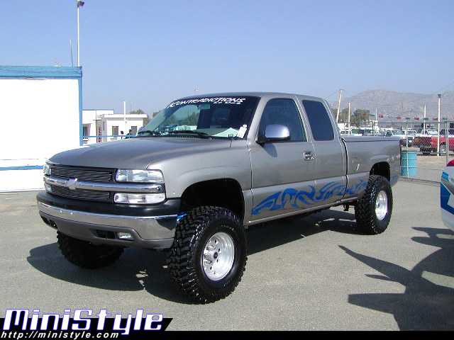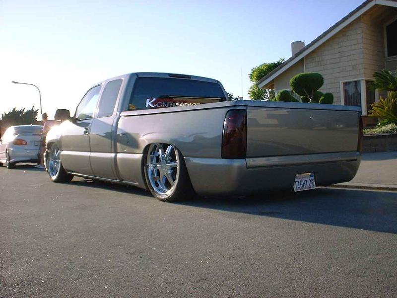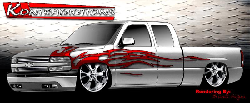 SHAVED TAILGATE, MOLDED ROLL PAN, APC CLEAR CORNERS, APC EURO TAILS PAINTED CANDY RED W/ MATCHING 3RD BRAKE LIGHT, DJ MOTORSPORTS GRILL W/ BILLET BOWTIE, SIR MICHAEL'S ROLL PAN, TRENZ BILLET ANTENNA...SOON SOME SICK AZZ TRIBAL FLAME GRAFIX COMMING OFF THE FRONT WHEEL DOWN THE SIDE OF THE BED