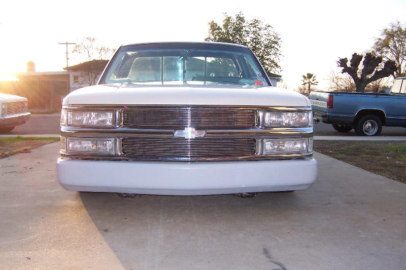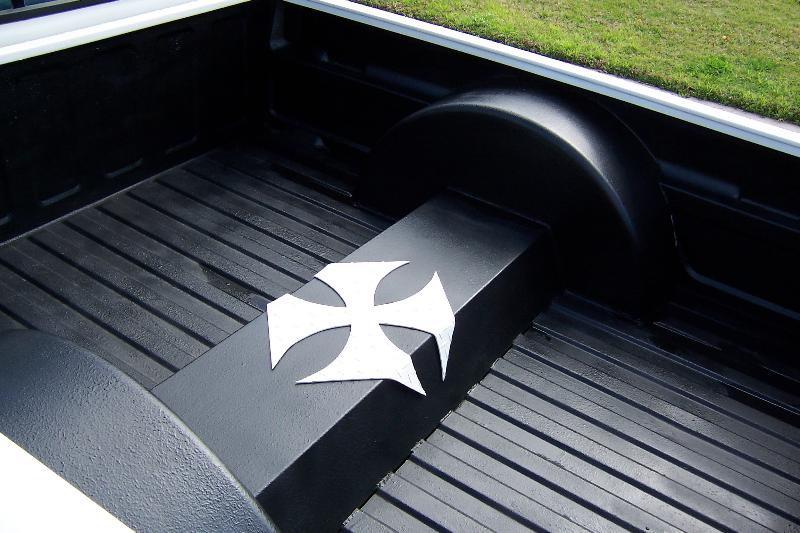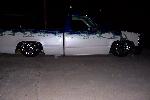 fully shaved tail lights, tail gate welded shut, roll pan, doors, upper bodyline, stake holes, mirrors,section an inch either way out of the bumper,bed tubbed,custom maltese cross mirrors,custom two tone paint pt cruiser electric blue on top escalade white on bottom with metallic silver flames seperating them striped in hok lime green