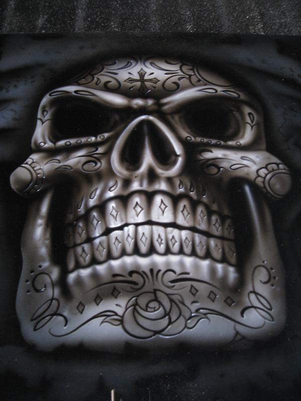 StreetScence SS bumper and mirrors, Sylvania Xenarc X2020 HID headlights, Color matched frontend, Caddy doorhandles, Gaylord lid, Shaved moldings, third brakelight, shaved roof gutters, gas lid, taillights, welded shut bed, 10.5" clear LED tails, and AVS retractable license plate holder. Webasto power slider sunroof, Spray on bedliner with a custom painted "dia de los muertos" skull painted on the notchcover.