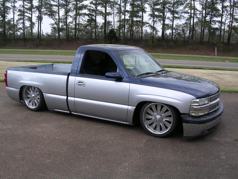 Two tone paint Dupont Chroma-Base Silver Pearl Metallic and Chroma-Base Indigo Blue Pearl Metallic, Billet Grill, Billet Bowtie, Euro Clear Parking lamps, Shaved Tailgate, Tahoe Chrome Grill, Hyper White hi/lo, Street Scene Electric Sport Mirrors, molded in Sir Michaels Rollpan, 2003 Silverado Taillights, tubbed out the bed and sheet metaled the floors and walls