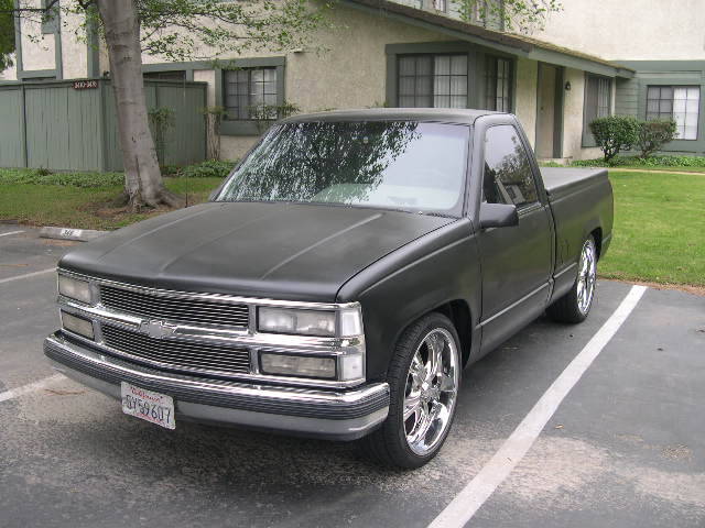 Shaved handles, and primer,sport mirrors, rollpan, billet grill and bowtie.