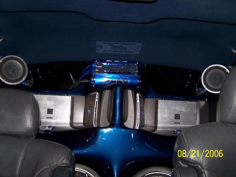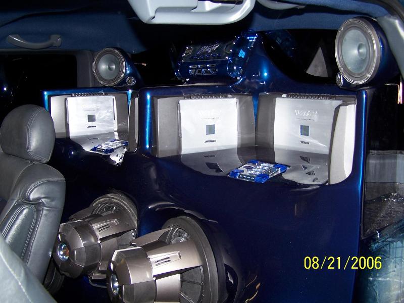 All ALPINE Equipment, 6000 watts, 6 amps total, all Stinger wires and Cap, Alpine D310E DVD Headunit, 8 sets of Alpine X Series seperates, 4 Alpine X series 12" sub's, All handmade fiberglass enclosures built by us, includeing doors, kicks and box and amp rack.