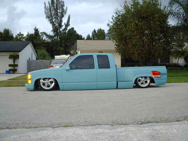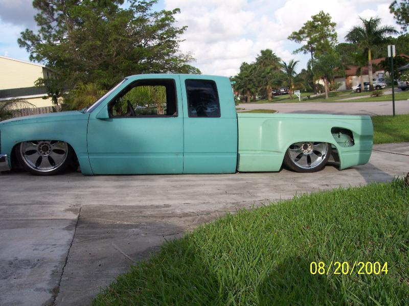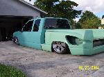 stock floor layin door on 22s. Fully shaved, full primer. Molded on 2003 toyota tundra tailights. Custom rollpan w/o license plate box because thats all they sell for stepsides with stepshavers, raised, widened and reshaped rear fenders to match lights and to clear for 22's. Sheetmetal and rhinolined bed. Shaved and rhinolined firewall. Booster relocated to underneath driver stepside.