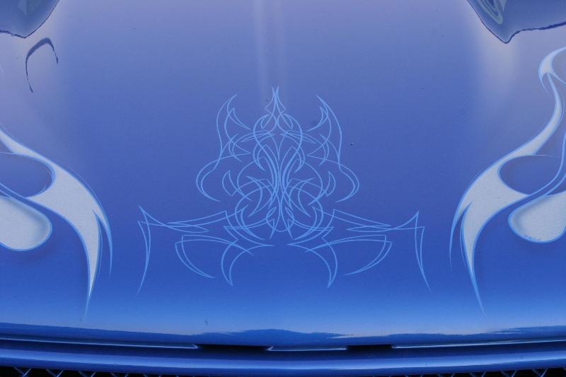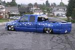 shaved handles, antenna, taillights, stake bed pockets, Grant Kustoms skin combo(rear molded shut)Painted Tru Blu with silver metal flake flames/Matrix System Paint/Blue sprayed by Musso Motorsports/ graphics and pinstripping by Kaotic Ryan