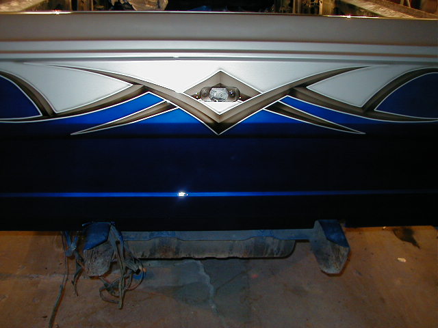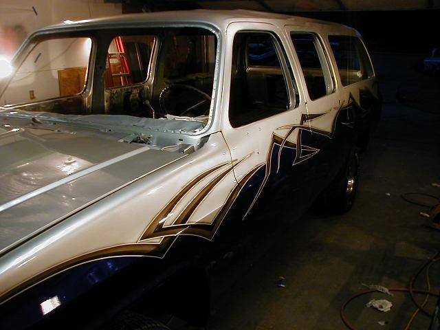 shaved body seams, markerlights,rain gutters silver metalic on top half, H of K blue candy on bottom half with bronze tribals down the side. Paint and Bodywork was done by Fabwerks.