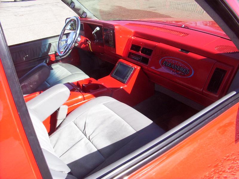 Katzkin Leather and saude seats, Full color change, new headliner, Painted almost all plastic, Painted Dash, Hand painted logo and Darryl Starbird autographed glove box, Custom Console with Clarion TV.Custom made Carpet. Billet Door sills, B.A.D. Gunslinger steering wheel.Billet Specialties wheel adapter Tubbed to the glass