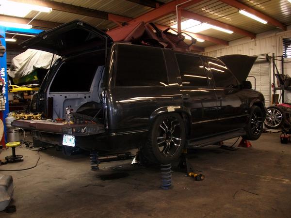 "01" Escalade conversion, Shaved Taillights w/ Cadillac Deville's molded in, Molded Roll pan, Painted Charcoal Blue Metallic.