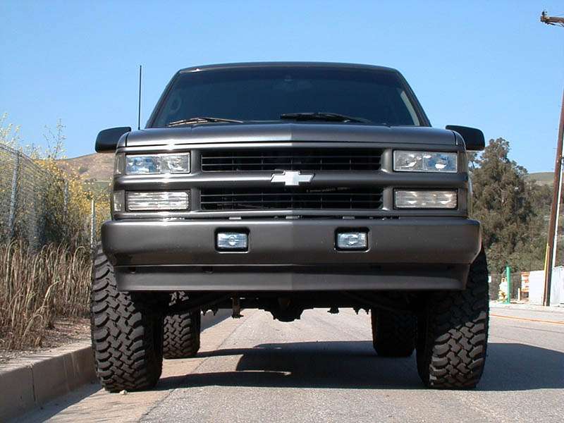 7" Fabtech - 3" suspension with 4" spindles. Suspension parts are powder coated metallic gray.