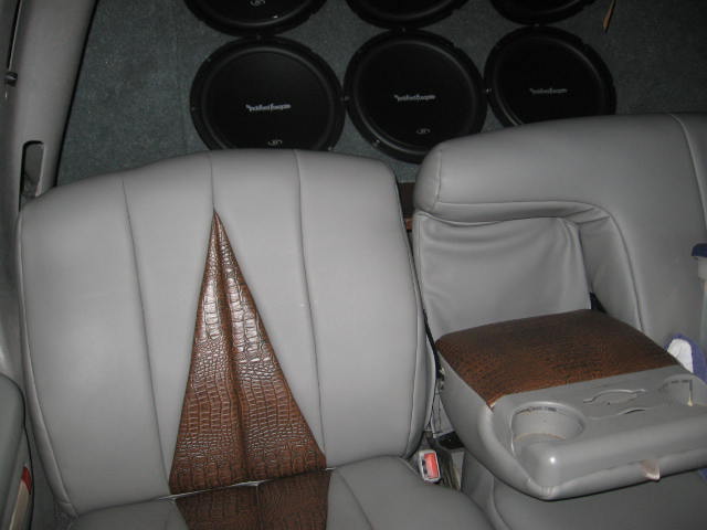 Gray ultra leather with tan alligator skin inserts. Black suede headliner.
