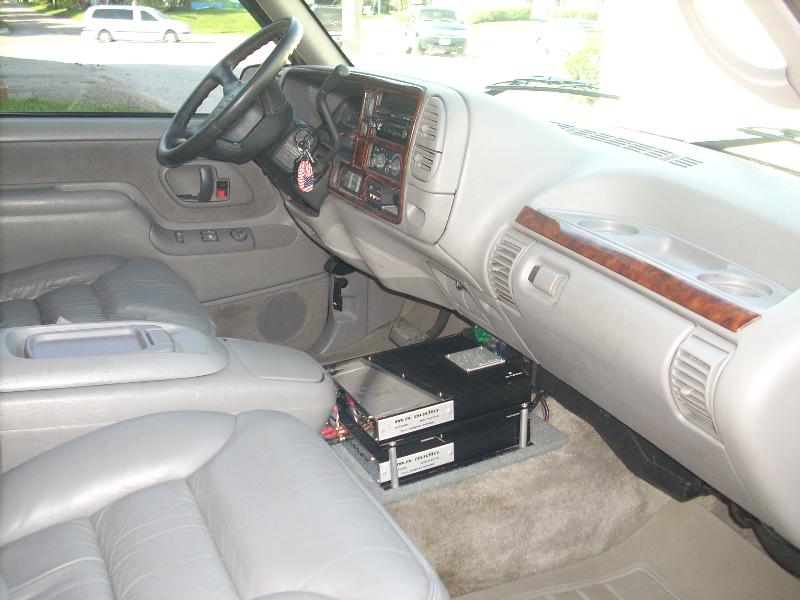 Jensen 7"flip out touch screen dvd player, 2 MA Audio amps 800 watt 4 channel and 800 watt mono block,Kenwood mini eq mounted in center console. sony 6.5" mid and tweeter combo in the doors factory 4x10" 2-ways in the rear(for now)2- 12" infinity subs. soon to have a pair of 8" 3 ways in back for more mids in the rear.