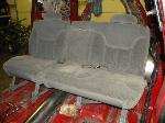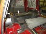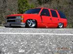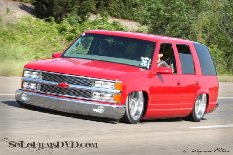 Driveshaft tunnel and fully sheet metaled rear notch and bridge area, fully sounddeadened, black carpet, 02 GMC front seats, modified rear seat, handmade black leather and black suede seat covers, black suede headliner, shaved stock front seat belts, shaved rear cargo cover holes, shaved rear seatbelt holes in B pillars, billet grab handles-dash-door paneltrim-ac vents-climate control-headlight switch-blinker-gear shift-gauge surround-speaker covers-door vents, white face gauges, Billet Specialties steering wheel with bowtie horn, dash dyed black, door panels dyed black with black suede inserts, 7" monitor molded into passenger airbag, 2000 Eddie Bauer Expedition Console, 7" in dash flipout dvd monitor, 7" monitors in head rests, Airlift guages in A pillar pod