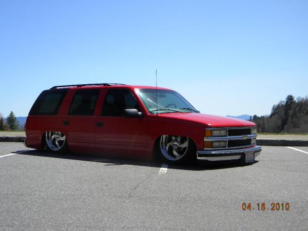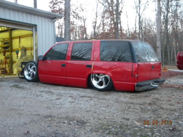 Front: Pie cut upper control arms, dehumped lower arms, drop spindles, frame notched for tie rods, tubbed firewall, Airlift 2600s