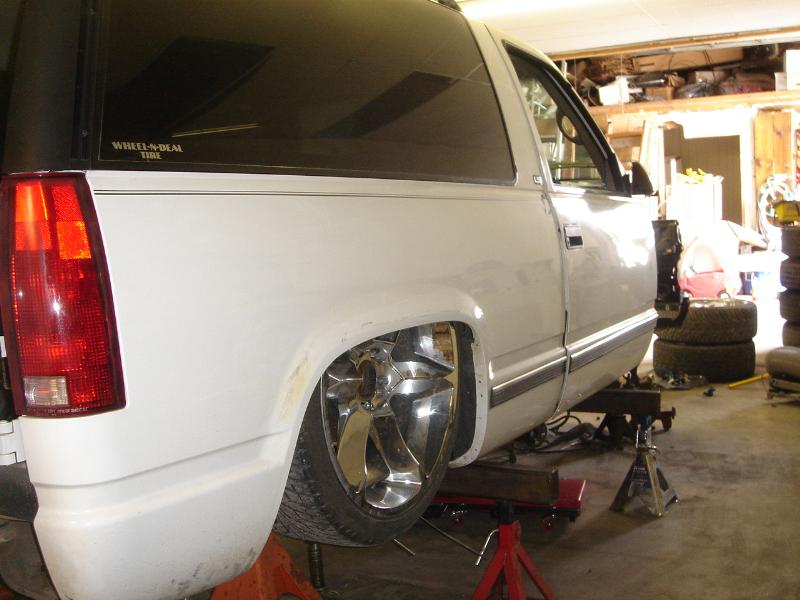 bagged front and back, custom lower control arm, triaangulated four link, stock floor bodydrop, set up to lay on 24s....