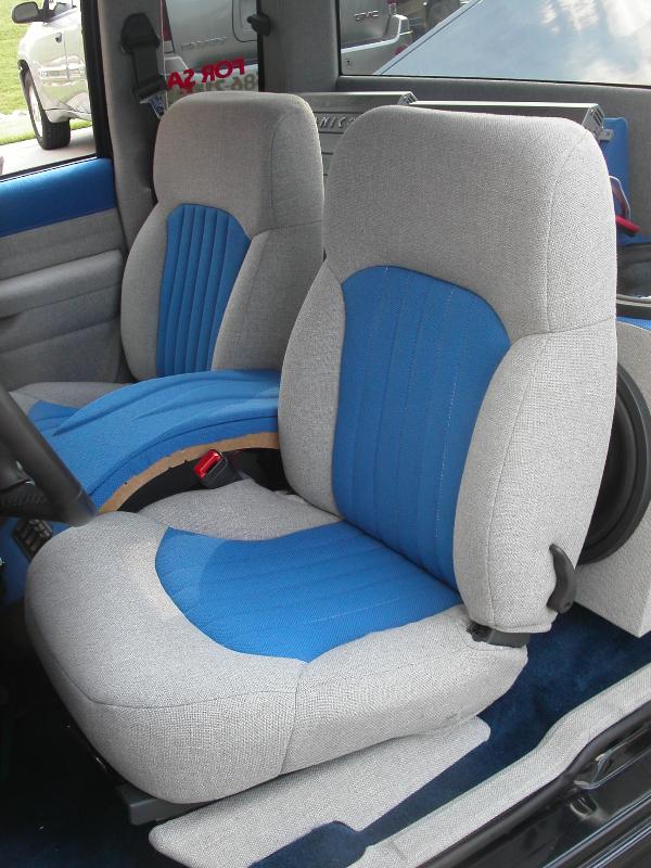 fully tweeded out in gray and blue, custom console, and custom sub box. flammed dash w/ blue flammed gauges and a flame rear view mirror front trenz.