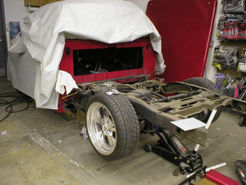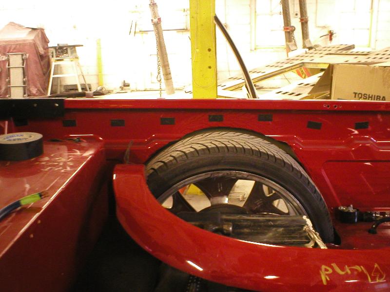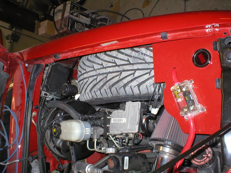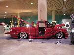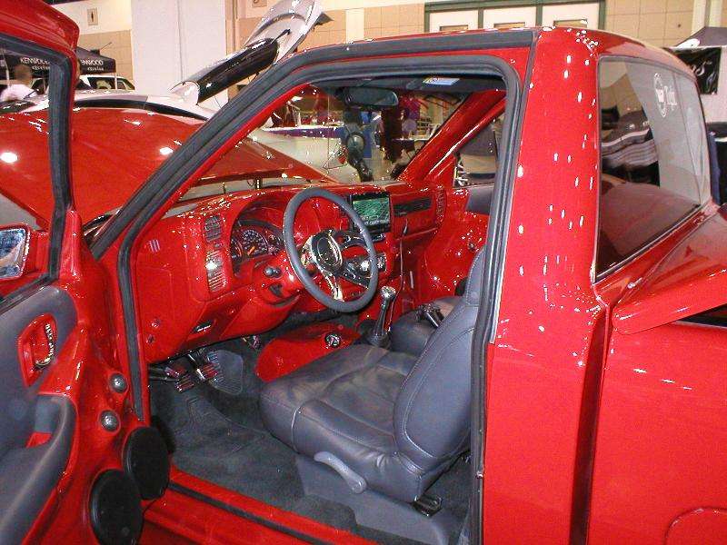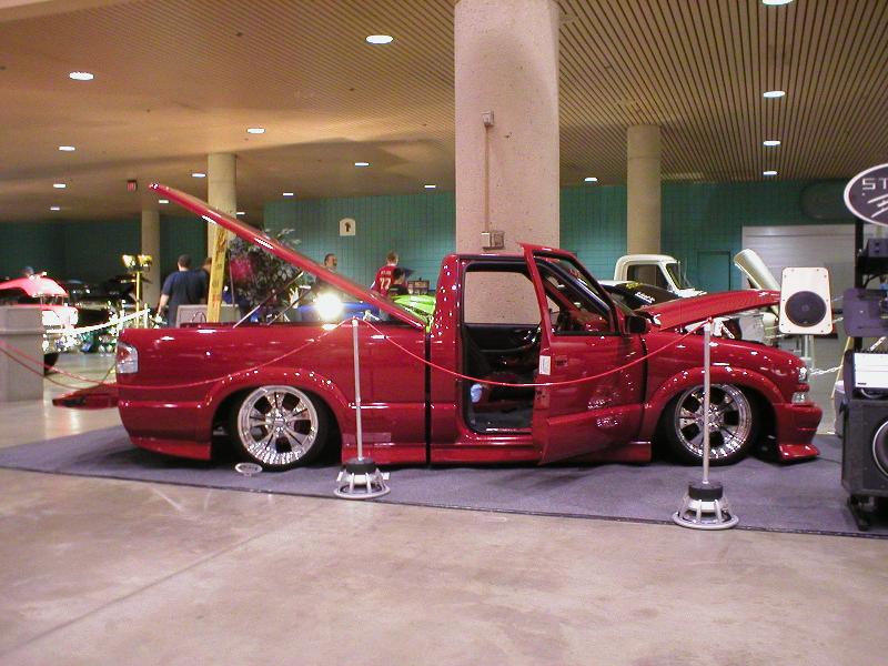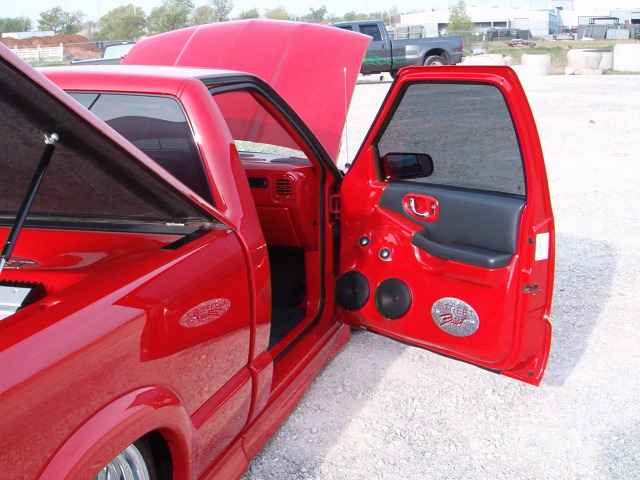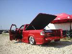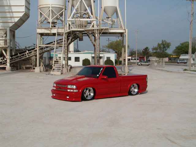 All Stock Red.. Shaved Third Brake Light.. Shaved Tailgate Handle.. Street Scene Mirrors and Wiper Cowl.. Goodmark 2.5" Cowl Induction Hood..