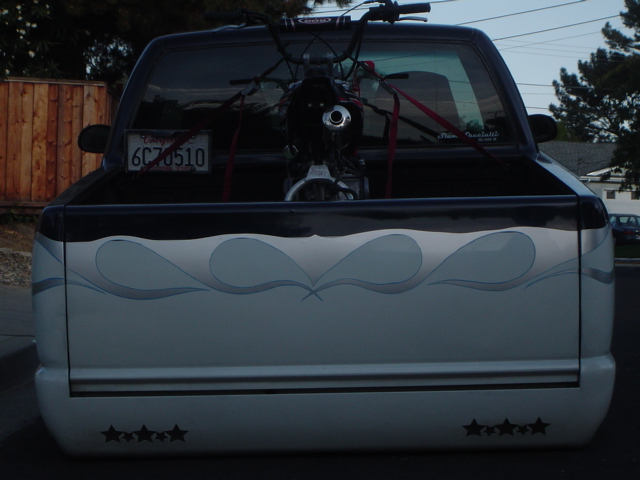 Shaven door handles, third brakelight, clears in front, M3 sprot mirrors, star fbi roll pan taillights, shorty antenna. custom two tone midnight blue and alpine white broken up with custom orion silver flames pinstriped with process blue.