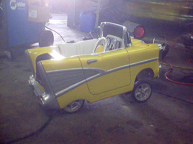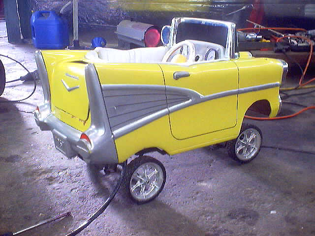2000 REPILICA OF A '57 CHEVY RAGTOP PRODUCED BY "TODAYS KID"COMPANY. ALL PLASTIC BODY STARTED OUT AS A FOOT POWERED "PEDAL CAR".HAS DUPONT URETHANE SUNFLOWER YELLOW SPRAYED ON WITH LOADS OF ORANGE PEARL ON TOP UNDER FOUR COATS OF CLEAR.