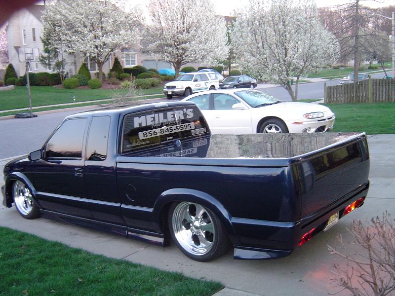 Stillen Front Airdam W/ 4 Fog Lights; Clear Corner Lenses; Street Scene Brushed Aluminum Speed Grills; Billet Chevrolet Bowtie; Cervinis Ram Air Hood; Trenz Billet Antenna; Street Scene Super Sport Mirrors; Smoothed and Body-Color Painted Door Handles and wiper cowl; Clear Third Brake Light; Gaylords Hard Tonneau Cover; Wade Bed Caps; Bed Rug Carpet Bedliner; Shaved Tailgate W/ Belltech Handle Relocation Kit; Shaved Taillights; Custom Molded Roll Pan With Toyota Supra Taillights