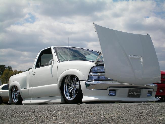 suicide hood, shaved taillights, tailgate skin LEDs, motorcycle mirrors, chrome grille with speed grille insert, billet step plates,
