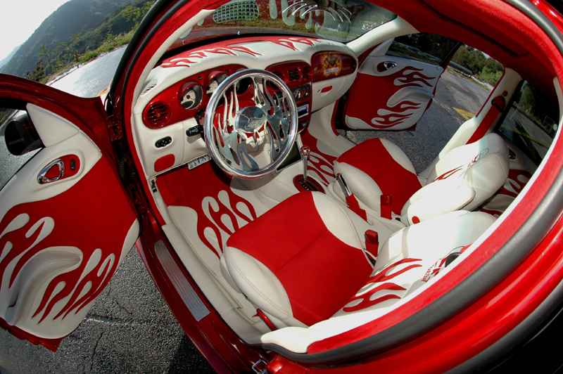 Again to many custom modifications to list. Some high points are: off white leather with red suede flames, every inch including the floor boards are done this way. Tons of billet. Custom one off steering wheel by B.A.D. Custom mirror, pedals, brake handle, shifter, etc.