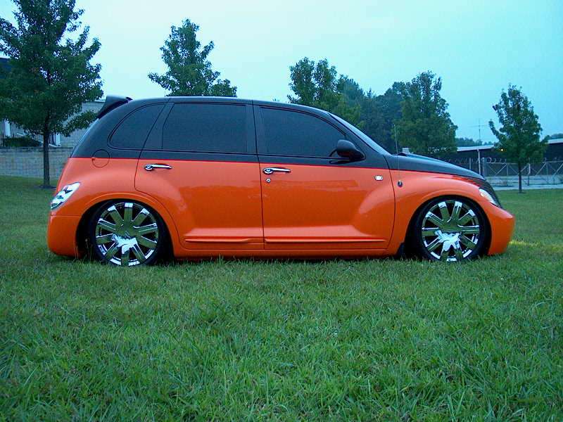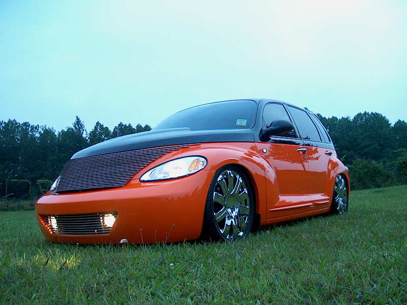 cowl hood,smooth rear and front bumpers, bilt wrap around grill and insert, wing, side marker lights, euro tails, all blue bulbs, House of Kolor black and Tangelo two tone paint, pin strip ,billet ant.polished cruiser emb. on hatch