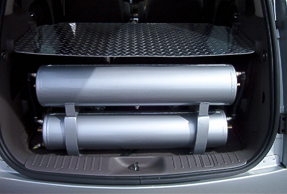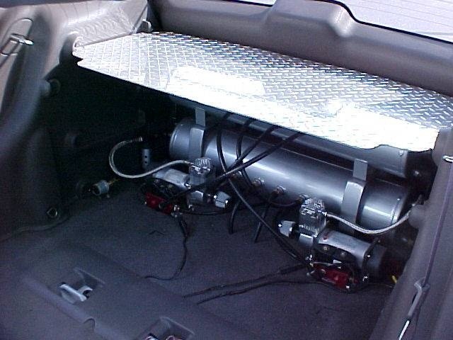 Air Ride Technologies, big red valves, 2 5 gallon tanks, 2 Viair 400 compressors, digital gauge. custom made brackets for tanks.